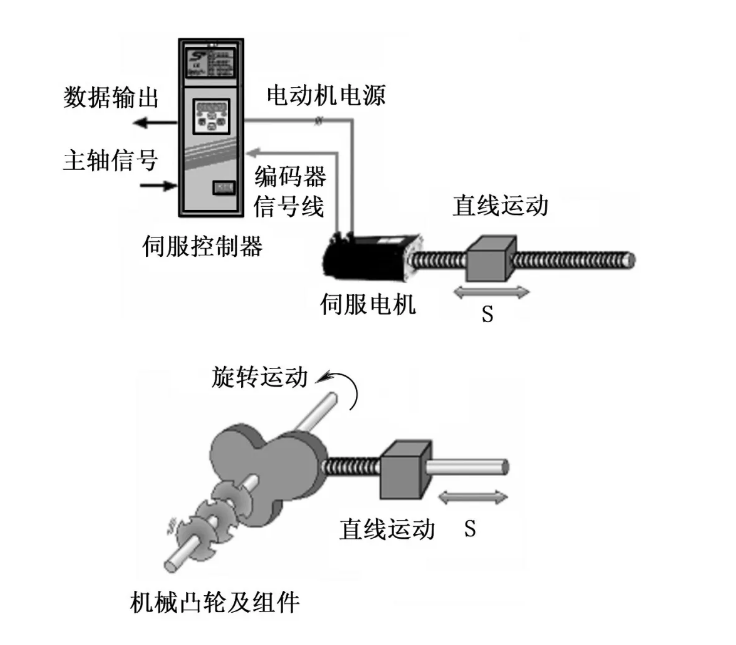 图1 电子凸轮(上)取代机械凸轮及行星轮结构(下)