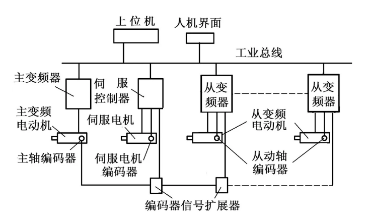 本机的控制系统由控制装置、驱动装置、工业总线等构成。控制装置由上位机、人机界面、各类采样元件和扩展器构成;驱动装置由变频器及伺服驱动器和变频电机及伺服电机构成;工业总线由具有高速通讯功能的通讯电缆、通讯面板和通讯接口构成(见图3)。