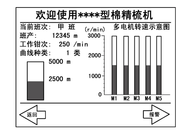 运行主画面左边显示了必要的工艺参数以及当班信息,右边动态演示整台机器所有电机同步运行的速度示意棒图。