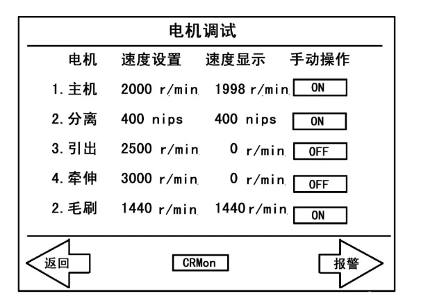 控制系统在机器正常工作时实行多轴同步运行,但在调试时各个电机又可根据需要分别单独运行,只要在人机界面上通过键入操作员口令即可进入“电机调试”画面。