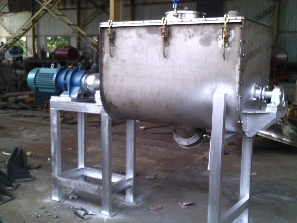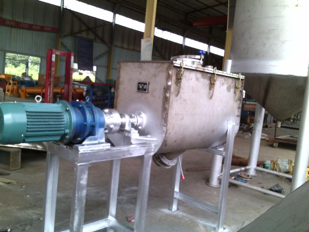 不锈钢卧式螺带混合机接触物料部分材质均为不锈钢,支架或夹套部分选用不锈钢或碳钢均可,根据成本考虑如无特殊要求夹套和支架部分建议使用碳钢。重庆客户在我厂定制的这台500L不锈钢卧式螺带混合机就是采用的接触物料部分用的不锈钢,支架这采用的碳钢材质。此台卧式螺带混合机未安装夹套为单层结构,应是该使用单位的生产工艺无加热或冷却要求。