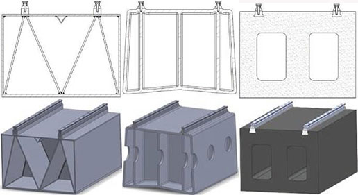 由于不同的物理材料特性以及生产和经济限制,不同的材料对设计过程提出了明显不同的要求。与前面介绍的不考虑材料的设计指南相比,本节将详细介绍基于材料的设计。图3.2显示了机床床身设计的三种不同选择。钢结构主要是由各种厚度的板材焊接而成,而铸铁和混凝土结构则是通过铸造材料来生产。在这种两种情况下,铸铁床、拔模角和壁的厚度都是一致的,而且角和边缘都是圆滑的。不同的壁厚是 由于材料的杨氏模量不同而造成的,以满足部件的 整体强度要求。由于铸铁、水泥混凝土和矿物铸件 的密度大约是其杨氏模量的倒数,因此在整体质量 上通常没有明显差异。