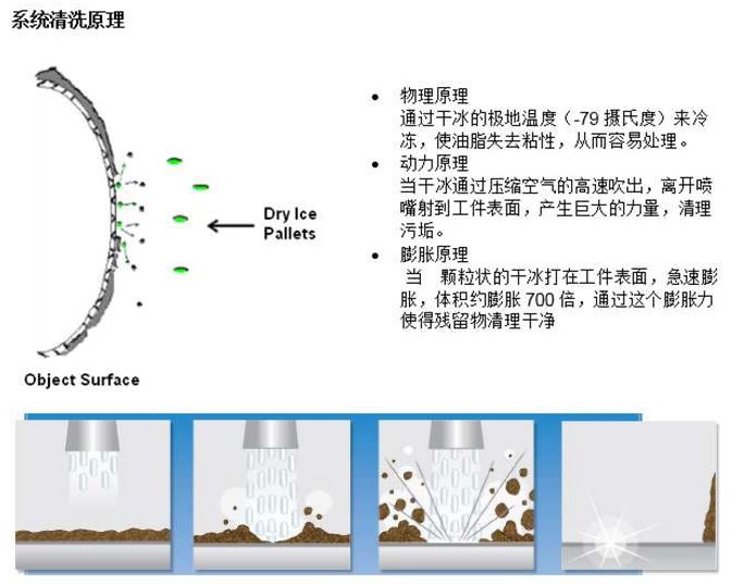 干冰喷射清洗,是利用由专门配制的空压机或利用工厂本身配制的压缩空气系统产生的压缩空气,在清洗设备内装入已制作好的干冰颗粒,在压缩空气的驱动下,高密度干冰颗粒或细粉随着压缩空气冲击到被清洗物体表面,从而起到清洗作用。与喷钢砂,喷塑料砂和喷苏打相似,干冰喷射介质干冰颗粒在高压气流中加速,冲击要清洗的表面。干冰清洗的独特之处在于干冰颗粒在冲击瞬间气化。干冰颗粒的动量在冲击瞬间消失。干冰颗粒与清洗表面间迅速发生热交换。致使固体CO2迅速升华变为气体。干冰颗粒在千分之几秒内体积膨胀近800倍,这样就在冲击点造成"微型爆炸"。由于CO2挥发掉了,干冰清洗过程没有产生任何二次废物,留下需要收集清理的只是清除下来的污垢。