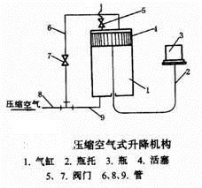 3:压缩空气式与滑道式混合升降机构,当压缩空气由气管1进入活塞芯子2,又经活塞芯子上部活塞5中部的孔口进入活塞筒体4,在压缩空气作用下,使活塞筒体4及滚子3上升,将瓶托6升起进行灌装,灌装后,升降机构随着自动机的转动,活塞筒体4上的滚子3进入下降滑道-7,在滑道的作用下,活塞筒体4被强制下降。这样已灌好的瓶下降到规定位置,并由拨出机构送出。当转到一定位置时,滚子3脱离滑道,完成一个升降操作。这种机构,在下降时比较稳定,活塞筒体的工作压力为245~382kPa。