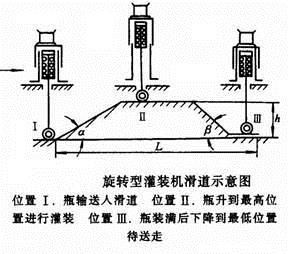 2:滑道式升降机构:这种滑道实际上是圆柱形凸轮机构。瓶行程的点必须保持瓶的嘴能压在灌装机的头上,其点应使瓶嘴离开灌装头,并便于退出。瓶托上升的凸轮升角一般取 α<30°~45°,降角取β≤70°。长度L可根据灌装时间而定。下图是灌装时从空瓶到盛满液体瓶在滑道式升降机构上的运行情况。