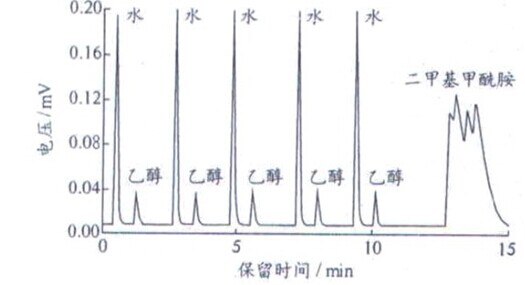 于混合均匀的试样中加入适量的内标物,用少许二甲基甲酰胺稀释、摇匀后,取上层清液(0.3μL)注入气相色谱仪,样品被载气(H2)带入色谱柱,在色谱柱中将水与样品中的其他挥发物分离开,用热导池检测器并记录色谱图,用内标法计算试样的含水量。