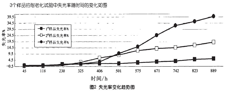 2.2 3个样品的耐老化试验中失光率和色差随时间