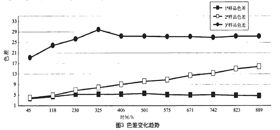 由图2可见,在230h之前,1#、2#、3。样品的失光率相同,在230h之后,3个样品的失光率出现了差异, 至近900h时,1#样品失光率为5%,2#样品为20%,3#样品达则到了40%。色差随时间的变化如图3所示。从图3可见,1 #样颜色变化zui小,2#样品次之,3#样变化zui大。