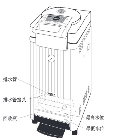 e)慢慢地拧开排水栓,从排水口排除灭菌用水。灭菌用水排