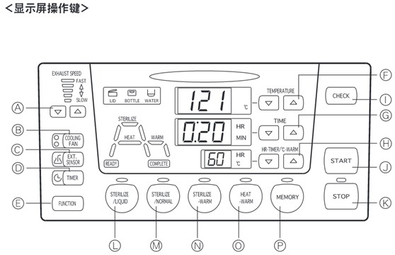 按下“灭菌”键,设置灭菌“温度F”、“时间G”(一般为121℃,20min)“排气量A”、“冷却风扇B”(液体灭菌时“排气量”、“冷却风扇”只能在降温降压过程设置),(液体灭菌时的灭菌时间延长参考例:121°C、20分的情况,放入2升水的金属容器24分,放入5升水的金属容器28分,放入10升水的金属容器35分。