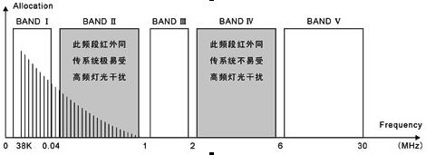 早期的红外线同声传译系统厂商几乎全部采用的是BAND II 频段的红外线同声传译系统。BAND II 频段的红外线同声传译系统很容易受高频驱动光源(如节能灯)的干扰,因为高频驱动光源会产生被调制的红外信号,这些被调制的红外信号主要集中在1MHz范围以内,正好落在BAND II(45kHz~1MHz)调制载波的频段,影响到红外通讯系统的声音质量和通讯距离(参见文献1:国际标准IEC 61603-1,文献5:国际标准IEC 61603-7)。如图1: