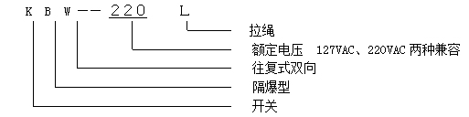 本产品适合各种严酷的环境,诸如矿山、仓库、港口的爆炸性气体环境中使用。尤其适合煤矿井下使用。防爆胶带机急停保护开关拉绳EX BKP(L)380V/IP66产品系台采用进口件的微处理器,高精度的数据处理及的工业可编程序保护算法,保护精度高,反应速度快。控制器(PLC)和人机屏(GOT)的矿用隔爆型高压真空配电装置,具有独立的高压隔离开关腔,配套移动变电站采用国际流行的低压测故障分断高压测电源的运行模式。该才产品既吸纳了的智能化技术和机构型式,又有机的结合了中国煤矿配套电气设备的特性,可与进口变压器和国产变压器配套使用。同时该产品符合DB 3836-2000《爆炸性环境防爆电气设备》*新国家标准规定,其技术指标、性能和结构等各方面均优于国内同等产品,为我国煤矿井下提供了一种性能优良、安全可靠的电气设备,是广大客户同类产品的*佳选择。适用于煤矿井下和其它周围介质中含有爆炸性体(甲烷混合物)的环境中,在交流50赫兹、10千伏、6千伏电流至400安倍的中性点不接地的三相电网中,作为移动变电站的6千伏侧的高压真空开关。主元件为一种新型高压真空开关,起到开断负荷电流及关合短路电流之用。 型号含义如下:
