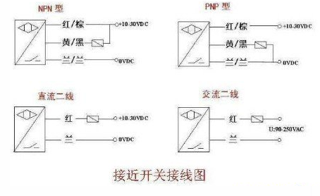 接近开关有两线制和三线制之区别,三线制接近开关又分为NPN型和PNP型,它们的接线是不同的。