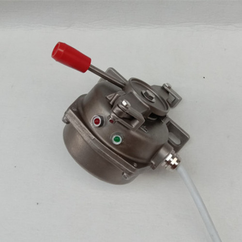 当胶带运输现场发生紧急事故时,拉动系在吊耳上的钢丝绳,是机内的滑块与开关作用,发出停机信号。松开钢丝绳后开关自动复位。