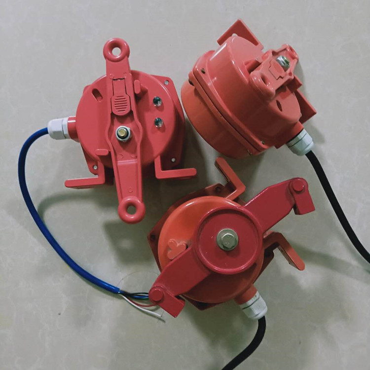 本开关采用回转式凸轮结构。当拉杆手回转时,凸轮随之转动,使微动开关动作,输出开关量,发出报警信号和停机信号。复位方式I型为自动复位,拉杆解除拉力后,凸轮结构自动复位到原始状态。II型为手工复位,凸轮轴回转到一定角度自锁定位,需手工复位手柄后凸轮方能返回原始状态。本装置采用防水、防尘密封设计,较好防止水、灰尘进入机壳内。