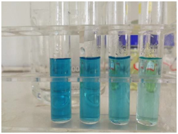 图1 不同浓度的嗪在酸性溶液中被高铁离子氧化成蓝绿色化合物(实图拍摄)