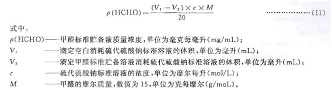 4.3.10甲醛标准贮备液:取2.8mL(浓度36%~38%),放入1L容量瓶中,加水稀释至刻度。此溶液1mL约相当于1mg甲醛,其准确浓度用下述碘量法标定:取20.00mL甲醛标准贮备液,置于250mL碘量瓶中,加入20.00mL碘溶液(4.3.5)和15mL氢氧化钠溶液(4.3.6),放置15min。加入20mL硫酸溶液(4.3.7),在放置15min,用溶液(4.3.8)滴定,至溶液呈淡黄色时,加入1ml淀粉溶液(4.3.9