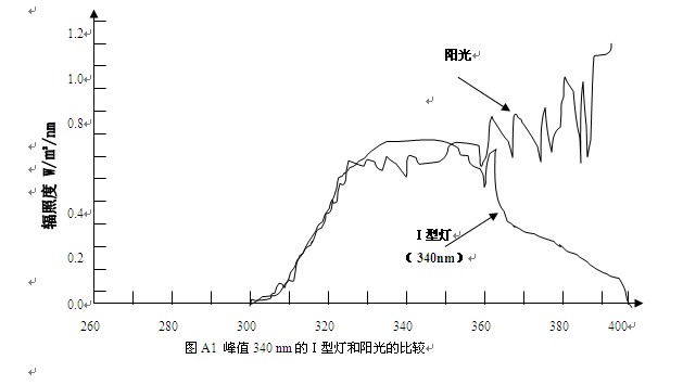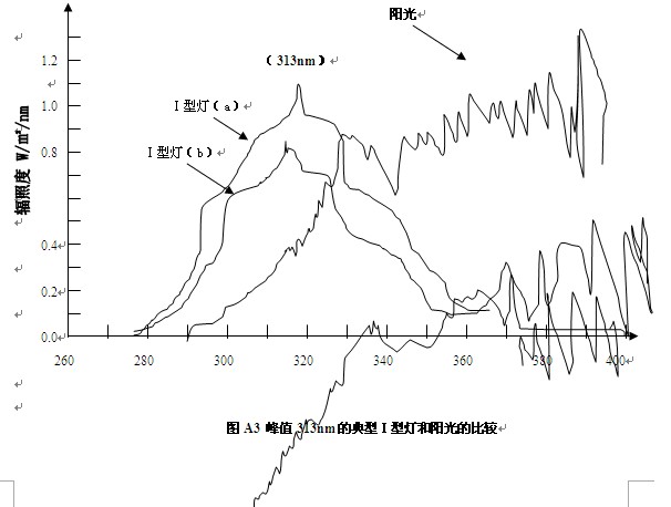 图A3表示两种普通Ⅱ型灯与夏天中午日光光谱分布的比较杭州奥科环境试验设备有限公司:: http:///Products/T9.html荧光紫外灯光源老化箱