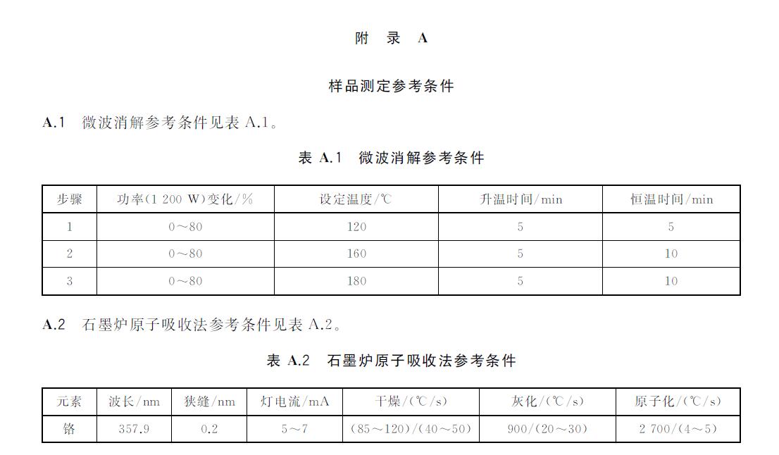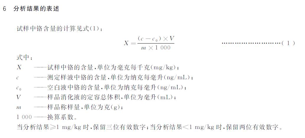 前 言 本标准代替GB/T5009.123—2003《食品中铬的测定方法》。本标准与GB/T5009.123—2003相比,主要变化如下:———标准名称修改为“食品安全国家标准 食品中铬的测定方法”;———样品前处理增加了微波消解法和湿法消解法;———增加了方法定量限(LOQ);———基体改进剂采用磷酸二氢铵代替磷酸铵;———删除第二法示波极谱法。1 范围本标准规定了食品中铬的石墨炉原子吸收光谱测定方法。本标准适用于各类食品中铬的含量测定。2 原理试样经消解处理后,采用石墨炉原子吸收光谱法,在357.9nm 处测定吸收值,在一定浓度范围内其吸收值与标准系列溶液比较定量。3 试剂和材料注:除非另有规定,本方法所用试剂均为优级纯,水为GB/T6682规定的二级水。3.1 试剂3.1.1 硝酸(HNO3)。3.1.2 高氯酸(HClO4)。3.1.3 磷酸二氢铵(NH4H2PO4)。3.2 试剂配制3.2.1 硝酸溶液(5+95):量取50mL 硝酸慢慢倒入950mL 水中,混匀。3.2.2 硝酸溶液(1+1):量取250mL 硝酸慢慢倒入250mL 水中,混匀。3.2.3 磷酸二氢铵溶液(20g/L):称取2.0g磷酸二氢铵,溶于水中,并定容至100mL,混匀。3.3 标准品重铬酸钾(K2Cr2O7):纯度>99.5%或经并授予标准物质证书的标准物质。3.4 标准溶液配制3.4.1 铬标准储备液:准确称取基准物质重铬酸钾(110 ℃,烘2h)1.4315g(精确至0.0001g),溶于水中,移入500mL 容量瓶中,用硝酸溶液(5+95)稀释至刻度,混匀。此溶液每毫升含1.000 mg铬。或购置经并授予标准物质证书的铬标准储备液。3.4.2 铬标准使用液:将铬标准储备液用硝酸溶液(5+95)逐级稀释至每毫升含100ng铬。3.4.3 标准系列溶液的配制:分别吸取铬标准使用液(100ng/mL)0mL、0.500mL、1.00mL、2.00mL、3.00mL、4.00mL 于25mL 容量瓶中,用硝酸溶液(5+95)稀释至刻度,混匀。各容量瓶中每毫升分别含铬0ng、2.00ng、4.00ng、8.00ng、12.0ng、16.0ng。或采用石墨炉自动进样器自动配制。注:所用玻璃仪器均需以硝酸溶液(1+4)浸泡24h以上,用水反复冲洗,最后用去离子水冲洗干净。4.1 原子吸收光谱仪,配石墨炉原子化器,附铬空心阴极灯。4.2 微波消解系统,配有消解内罐。4.3 可调式电热炉。4.4 可调式电热板。4.5 压力消解器:配有消解内罐。4.6 马弗炉。4.7 恒温干燥箱。4.8 电子天平:感量为0.1mg和1mg。5 分析步骤5.1 试样的预处理5.1.1 粮食、豆类等去除杂物后,粉碎,装入洁净的容器内,作为试样。密封,并标明标记,试样应于室温下保存。5.1.2 蔬菜、水果、鱼类、肉类及蛋类等水分含量高的鲜样,直接打成匀浆,装入洁净的容器内,作为试样。密封,并标明标记。试样应于冰箱冷藏室保存。 4 仪器设备注:所用玻璃仪器均需以硝酸溶液(1+4)浸泡24h以上,用水反复冲洗,最后用去离子水冲洗干净。4.1 原子吸收光谱仪,配石墨炉原子化器,附铬空心阴极灯。4.2 微波消解系统,配有消解内罐。4.3 可调式电热炉。4.4 可调式电热板。4.5 压力消解器:配有消解内罐。4.6 马弗炉。4.7 恒温干燥箱。4.8 电子天平:感量为0.1mg和1mg。5 分析步骤5.1 试样的预处理5.1.1 粮食、豆类等去除杂物后,粉碎,装入洁净的容器内,作为试样。密封,并标明标记,试样应于室温下保存。5.1.2 蔬菜、水果、鱼类、肉类及蛋类等水分含量高的鲜样,直接打成匀浆,装入洁净的容器内,作为试样。密封,并标明标记。试样应于冰箱冷藏室保存。5.2 样品消解5.2.1 微波消解准确称取试样0.2g~0.6g(精确至0.001g)于微波消解罐中,加入5 mL 硝酸,按照微波消解的操作步骤消解试样(消解条件参见A.1)。冷却后取出消解罐,在电热板上于140 ℃ ~160 ℃ 赶酸至0.5mL~1.0mL。消解罐放冷后,将消化液转移至10mL容量瓶中,用少量水洗涤消解罐2次~3次,合并洗涤液,用水定容至刻度。同时做试剂空白试验。5.2.2 湿法消解准确称取试样0.5g~3g(精确至0.001g)于消化管中,加入10mL 硝酸、0.5mL 高氯酸,在可调式电热炉上消解(参考条件:120 ℃保持0.5h~1h、升温至180 ℃ 2h~4h、升温至200 ℃~220 ℃)。若消化液呈棕褐色,再加硝酸,消解至冒白烟,消化液呈无色透明或略带黄色,取出消化管,冷却后用水定容至10mL。同时做试剂空白试验。5.2.3 高压消解准确称取试样0.3g~1g(精确至0.001g)于消解内罐中,加入5mL 硝酸。盖好内盖,旋紧不锈钢外套,放入恒温干燥箱,于140 ℃~160 ℃下保持4h~5h。在箱内自然冷却至室温,缓慢旋松外罐,取出消解内罐,放在可调式电热板上于140 ℃~160 ℃赶酸至0.5mL~1.0mL。冷却后将消化液转移至10mL 容量瓶中,用少量水洗涤内罐和内盖2次~3次,合并洗涤液于容量瓶中并用水定容至刻度。同时做试剂空白试验。5.2.4 干法灰化准确称取试样0.5g~3g(精确至0.001g)于坩埚中,小火加热,炭化至无烟,转移至马弗炉中,于550 ℃恒温3h~4h。取出冷却,对于灰化不的试样,加数滴硝酸,小火加热,小心蒸干,再转入550 ℃高温炉中,继续灰化1h~2h,至试样呈白灰状,从高温炉取出冷却,用硝酸溶液(1+1)溶解并用水定容至10mL。同时做试剂空白试验。5.3 测定5.3.1 仪器测试条件根据各自仪器性能调至状态。参考条件见A.2。5.3.2 标准曲线的制作将标准系列溶液工作液按浓度由低到高的顺序分别取10μL(可根据使用仪器选择进样量),注入石墨管,原子化后测其吸光度值,以浓度为横坐标,吸光度值为纵坐标,绘制标准曲线。5.3.3 试样测定在与测定标准溶液相同的实验条件下,将空白溶液和样品溶液分别取10μL(可根据使用仪器选择进样量),注入石墨管,原子化后测其吸光度值,与标准系列溶液比较定量。对有干扰的试样应注入5μL(可根据使
