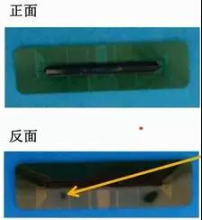 样品为厚度400微米长度25左右毫米的硅片基底芯片,反面粘有塑料薄片。(缺陷点的记号笔标记位置)