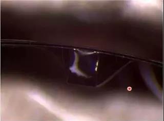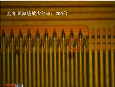 使用金相显微镜放大200倍后发现右起第三根指针有一小截与第四根指针相连,为缺陷位置,需要从中间刨开。
