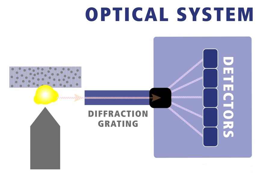 所有发射光谱仪均由三大部分构成,首先是光源,其可激发金属样品中的原子,使其发射特征光谱,或称为发射谱线,其需要将少部分样品加热到几千摄氏度的高温状态。这是由光谱仪中高压光源通过电极完成的。样品和电极之间的电势差会引起放电,这个放电能够击穿样品,将样品加热,使材料表面物质蒸发,激发材料中的原子使其发射出元素的特征谱线。
