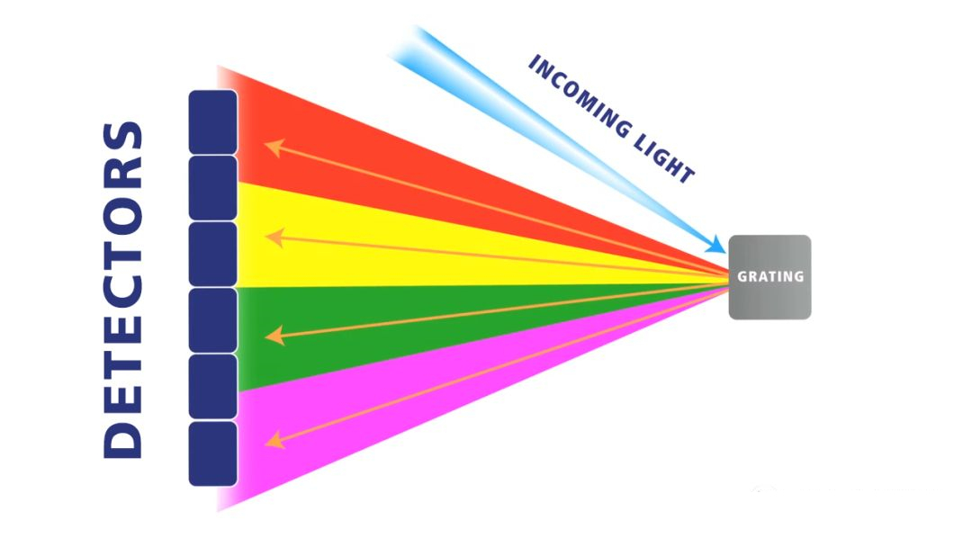 样品内原子发射的特征光谱会进入到光学系统内,被高科技的光栅色散成不同的特征谱线,光栅刻线可达3600条/mm。