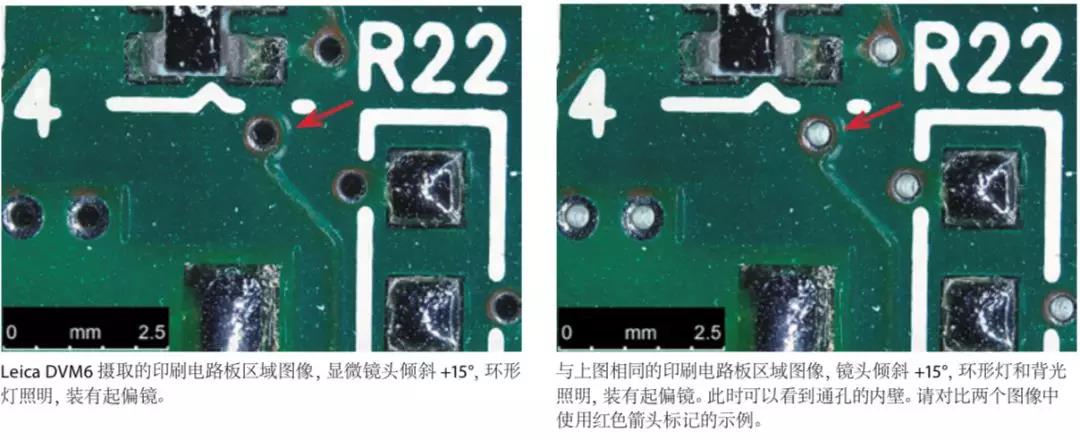 (Leica DVM6 使用环形入射光和背光照明摄取的印刷电路板局部图像。光线通过印刷电路板的通孔射入)