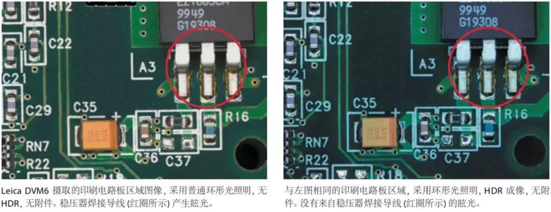 下面显示的印刷电路板区域图像(带有稳压器) 分别在使用和未使用HDR 的条件下摄取。