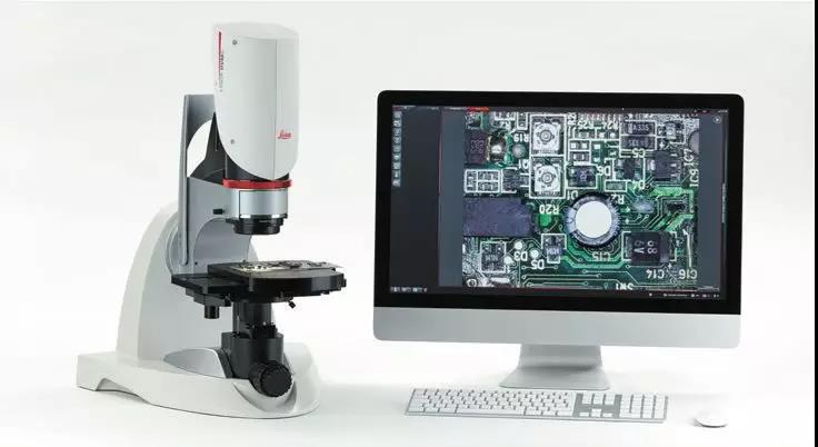 下面是Leica DVM6 数字显微镜的照片,其载物台上放有一块PCB (印刷电路板)。