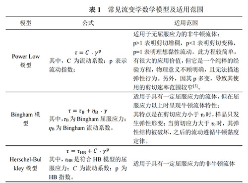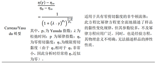 3、流变学数据分析方法 3.1 数学模型 在对物质的流变学特征进行测定后,可以使用数学模型对测定结果进行拟合,寻找与样品的流变学特征相吻合的数学模型,计算出可以表征样品流变学特征的关键参数。在稳态流变学研究中,目前常用的流变学数学模型有Power Low 模型、Bingham模型、Herschel-Bulkley模型和Carreau/Yasuda模型[48]。