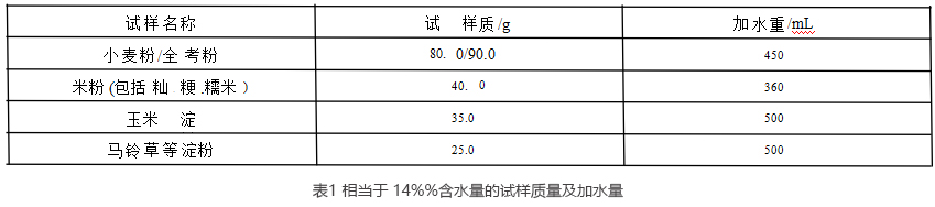 将称好的试样置于烧杯中,按表 1 量取相应的加水量,先加入约 100 mL 水,用玻璃棒搅拌约 20 s,然后分两次每次约加入 100 mL 水制成均匀无结块的悬浮液 ,将其转移至测量钵中,再用剩余的水分三次洗涤烧杯中残余试样并全部转移至测量钵中。从加样到冲洗试样时间应控制在 2 min 以内。
