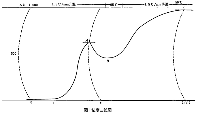 C一一最终粘度值(A. U. ),糊化物按一定降温速率冷却时,糊化物胶凝,粘度值升高,温度降至 50℃时的粘度值为最终粘度值 ,读数准确至5 A. U.