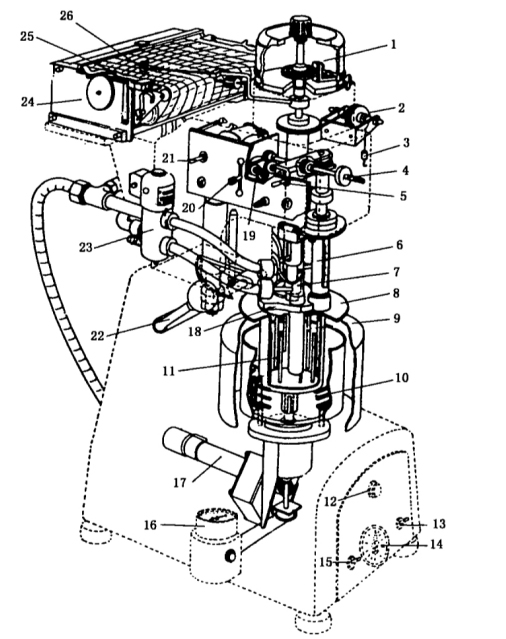 5.7.7 关闭电源。将搅拌器与传感竖轴外开,将冷却套杆提升至处,然后压下升降柄抬起仪器上半部并使向右转动 90°。