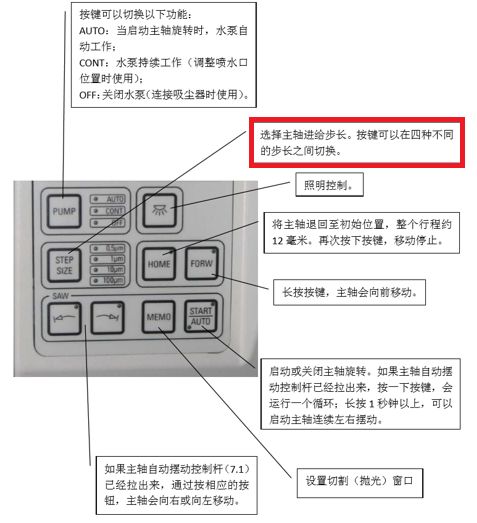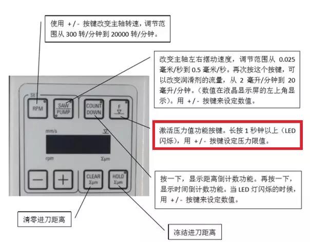 SnSe-ReCl的材料强度不高,样品研磨到厚度100μm以下,压力稍大即会被压碎裂开。徕卡精研一体机TXP,具备应力反馈功能,即实时监控和控制样品与研磨砂纸的压力,配合高达到每步500nm的高精度步进研磨功能,可以使得像热电材料这样的脆性样品也能轻松研磨厚度至30μm以下。以下图片是TXP的操作面板的按键功能介绍。