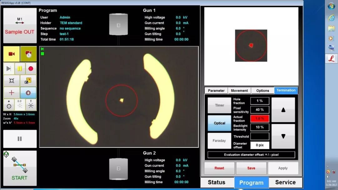 之后将磨好的样品粘上钼环,就可以移入徕卡多功能离子减薄仪RES102内进行离子减薄。通常,热电材料对离子束轰击的热损伤和离子束冲击造成的非晶化损伤非常敏感,对于某些类型的离子减薄仪,即使降低电压和使用冷冻模式也很难得到没有结构破坏的好样品。而RES102制备这类样品的优势在其离子束采用非聚焦式的宽束离子枪,有效避免样品的局部热损伤和非晶化损伤,并且可以获得相比聚焦式离子枪大得多的观察薄区。另外,RES102有着几项非常值得推荐的是功能,比如非透明样品的穿孔自动终止或切换至下一步操作的功能。如下图所示,设定好穿孔率和目标穿孔区域,RES102将自动完成离子减薄流程。