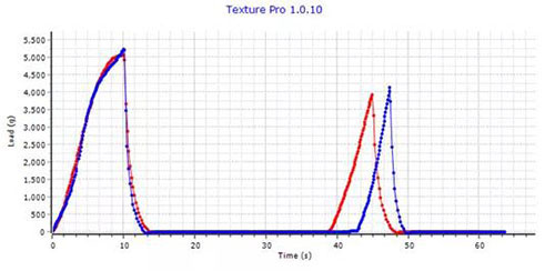 当触发负载(或力值)达到5克时,测试开始。此时,探头以1mm/s的测试速度下降至指定距离。此时探头感知的阻力为峰值负载;然后探头返回至原位置并停留5s后进行第二循环的测试。