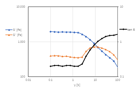 除了上述在旋转模式下进行的测试之外,也可以使用振荡测试法进行屈服应力测试:固定测试频率,通过改变应力或应变的方式进行振幅扫描,一般情况下控制应变的模式(CSD, controlled shear deformation)。对于粘弹性材料,G' 表征其弹性部分,G'' 表征其粘性部分。