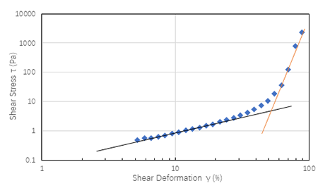 以剪切应力为自变量,设置对数增长的应力斜坡。对于粘弹性材料,当剪切应力值低于屈服点时,样品发生弹性形变,形变与应力是线性关系,代表材料的线性弹性区间。当应力值超过屈服点之后,应变增加的速率显著快于应力,曲线的斜率也随之不断增加。