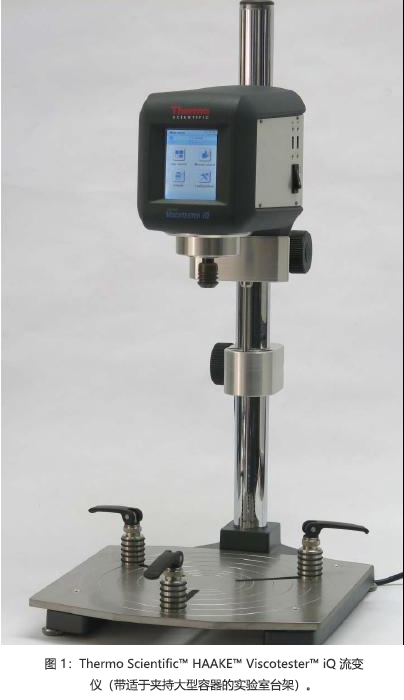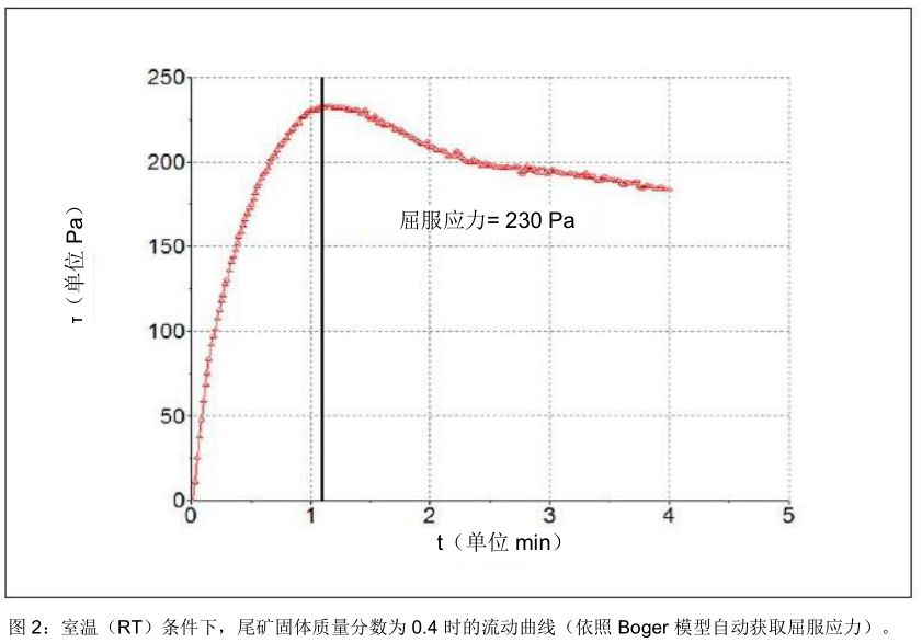 实验结果与讨论为防止发生壁滑移,我们推荐使用桨叶转子对尾矿进行流变测试。图 1 所示为带有桨叶结构及开式台架(便于在大型容器中测试样品)的HAAKE Viscotester iQ 流变仪。在该项研究中,已对不同固体质量分数的砂矿尾矿进行了测试,以便随后获得屈服应力与质量分数关系图。图 2 所示为依照 Boger 模型确定屈服应力的示例。该项测试中所用的尾矿固体质量分数为0.4。