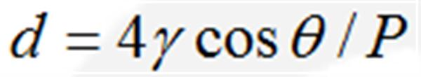 其中d为孔径,γ为润湿液与渗透液间的界面张力,θ为润湿液与膜材料的接触角,P为开孔压力。
