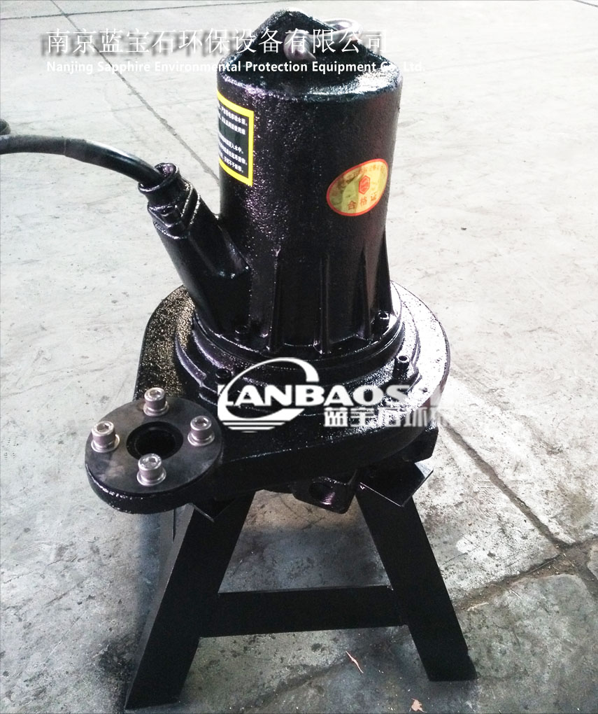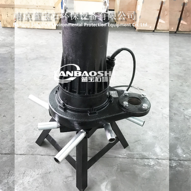 潜水离心曝气机的结构为直联式,产品为自吸式曝气,高速旋转的叶轮产生的离心力,在叶轮进口处形成的负压吸入空气和水,在混合室里将一定比例的气水混合,在强大的离心力作用下,排开周围水形成低压区吸入水流;同时,在叶轮进口处制造真空而吸入空气,在混气室中气与水充分混合形成均匀的气水混合液,在离心力作用下沿叶轮的切线方向经流道喷射而出,向圆周方向扩散使水流成对流循环,而细碎的微小气泡其比表面积大,上升速度缓慢,保证充分与水混合,从而达到高效充氧曝气的效果,使得该机动力效率优于其它种类的曝气机。