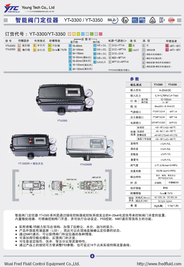 YT-3300L智能阀门定位器 | YTC智能阀门定位器YT-3300系列是通过接收控制器或者控制系统中发出的4-20M电流信号来控制阀门开度的装置。内置微处理器,可精确控制阀门开度,并执行自动控制PID控制,HATE通讯等强有力的功能。 | 韩国永泰智能阀门定位器 | YT-3300分按作用形式分:单作用和双作用,按防爆等级分:防爆和非防爆区分 | 直行程双作用非防爆型号 | YT-3300LDn0220S, YT-3300LDn1220S, YT-3300LDn2220S, YT-3300LDn3220S, YT-3300LDn4220S, YT-3300LDn0221S, YT-3300LDn1221S, YT-3300LDn2221S, YT-3300LDn3221S, YT-3300LDn4221S, YT-3300LDn0200S, YT-3300LDn1200S, YT-3300LDn2200S, YT-3300LDn3200S, YT-3300LDn4200S, YT-3300LDn0201S, YT-3300LDn1201S, YT-3300LDn2201S, YT-3300LDn3201S, YT-3300LDn4201S, YT-3300LDn0220S, YT-3300LDn1220S, YT-3300LDn2220S, YT-3300LDn3220S, YT-3300LDn4220S, | 直行程双作用防爆型号 EX iaⅡCT5/CT6 | YT-3300LDi0220S, YT-3300LDi1220S, YT-3300LDi2220S, YT-3300LDi3220S, YT-3300LDi4220S, YT-3300LDi0221S, YT-3300LDi1221S, YT-3300LDi2221S, YT-3300LDi3221S, YT-3300LDi4221S, YT-3300LDi0200S, YT-3300LDi1200S, YT-3300LDi2200S, YT-3300LDi3200S, YT-3300LDi4200S, YT-3300LDi0201S, YT-3300LDi1201S, YT-3300LDi2201S, YT-3300LDi3201S, YT-3300LDi4201S, YT-3300LDi0220S, YT-3300LDi1220S, YT-3300LDi2220S, YT-3300LDi3220S, YT-3300LDi4220S, | 直行程单作用非防爆型号 | YT-3300LSn0220S, YT-3300LSn1220S, YT-3300LSn2220S, YT-3300LSn3220S, YT-3300LSn4220S, YT-3300LSn0221S, YT-3300LSn1221S, YT-3300LSn2221S, YT-3300LSn3221S, YT-3300LSn4221S, YT-3300LSn0200S, YT-3300LSn1200S, YT-3300LSn2200S, YT-3300LSn3200S, YT-3300LSn4200S, YT-3300LSn0201S, YT-3300LSn1201S, YT-3300LSn2201S, YT-3300LSn3201S, YT-3300LSn4201S, YT-3300LSn0220S, YT-3300LSn1220S, YT-3300LSn2220S, YT-3300LSn3220S, YT-3300LSn4220S, | 直行程单作用防爆型号 EX iaⅡCT5/CT6 | YT-3300LSi0220S, YT-3300LSi1220S, YT-3300LSi2220S, YT-3300LSi3220S, YT-3300LSi4220S, YT-3300LSi0221S, YT-3300LSi1221S, YT-3300LSi2221S, YT-3300LSi3221S, YT-3300LSi4221S, YT-3300LSi0200S, YT-3300LSi1200S, YT-3300LSi2200S, YT-3300LSi3200S, YT-3300LSi4200S, YT-3300LSi0201S, YT-3300LSi1201S, YT-3300LSi2201S, YT-3300LSi3201S, YT-3300LSi4201S, YT-3300LSi0220S, YT-3300LSi1220S, YT-3300LSi2220S, YT-3300LSi3220S, YT-3300LSi4220S, |