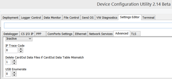 要避免在表定义不匹配时没有新文件写入存储卡的问题,可以通过将数据记录器设置为 1 来启用数据记录器中的“如果 CardOut 数据表不匹配,则删除 CardOut 数据文件”设置。此设置位于数据记录器“设置编辑器”的“ senior”选项卡下: