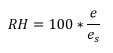 其中e是观测/测量的水气压,并且es是饱和水气压。然而,水气压可能不是直观的概念。简而言之,相对湿度是给定体积空气中观察到的水量除以空气在不产生降水的情况下可以容纳的极大水量。该饱和点高度依赖于温度。