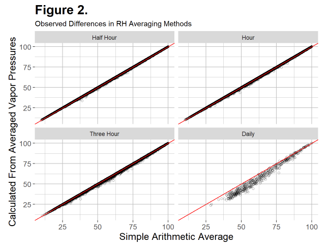 如果这两种方法相同,我们希望所有数据点都排在红色 1:1 线上。对于半小时和每小时的间隔,有很好的一致性。但是,对于较长的间隔,误差会大大增加。有趣的是,至少在这些数据中,简单平均引起的误差几乎总是会导致正偏差。换句话说,简单的算术平均值几乎总是高估平均相对湿度。