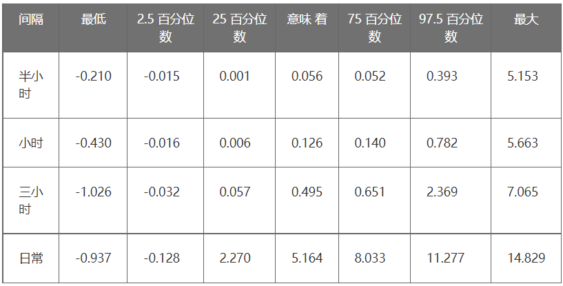 表1显示了平均方法(简单平均值减去水气压平均值)差异的一些统计数据,包括平均值,极大值和极小值,以及一些百分位数。50% 的数据介于 25% 到 75 百分位数之间,95% 的数据介于 2.5 到 97.5 百分位数之间。
