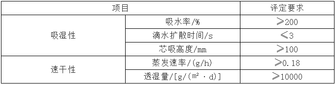 GB/T 21655.1方法标准中以织物的吸水百分率、滴水扩散时间和芯吸高度三种指标来表示织物的吸湿性能,以织物在标准大气环境中的水分蒸发速率和透湿量来表示产品的速干性能,具体参数指标如表1所示。 表1 针织类产品单项组合试验吸湿速干性的评定