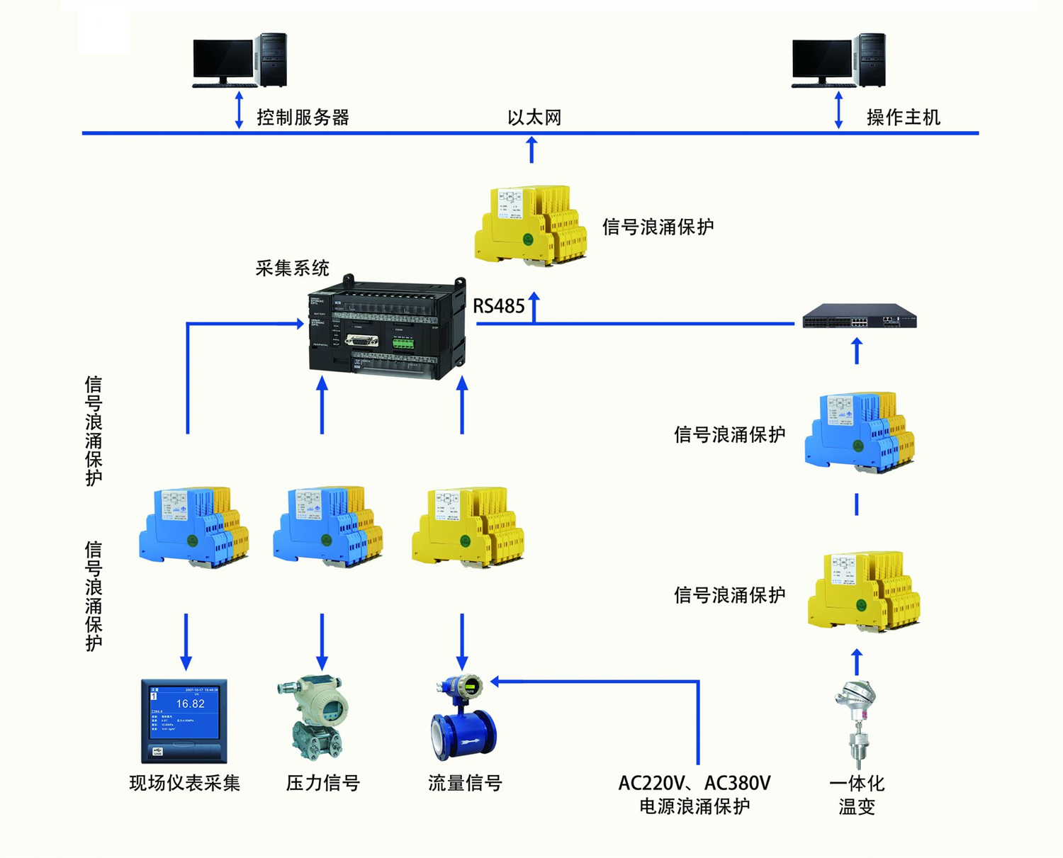 防雷栅:为保护系统免受雷电损坏,在出入系统的信号回路中设置防雷栅,防雷栅安装在机柜中。现场仪表选用带防雷功能的仪表。