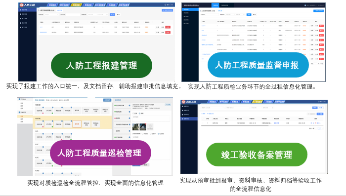 通过工程报建、质量监督、质量巡检等模块的打造,实现人防工程的全面管理。